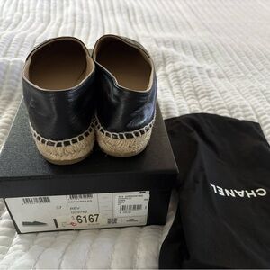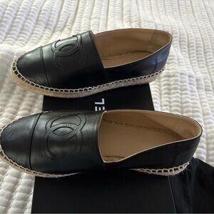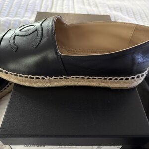 Elegant black leather espadrilles. Iconic CHANEL logo on top. Comfortable woven sole.