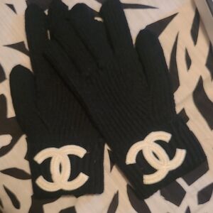 Stylish black gloves with iconic white Chanel logo. Perfect for any occasion. don't have tag inside and no size inside, but they are knit and can fit up to normal large. I don't have any papers on these.