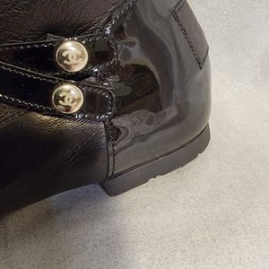 A Gorgeous pair of CHANEL Black Lambskin riding style boots having a patent leather cap toe and double straps. Both straps have the classic Double C logo on the side buttons and a "Chanel" named backplate to the upper heel.