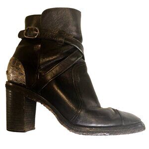 CHANEL Black Leather Boots W/Criss Cross Strap & Metal Plate Size 38