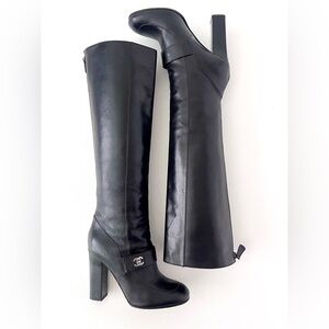 CHANEL | Black Leather Knee High Heel Boots CC Logo Turnlock EU 37
