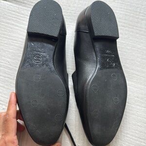 Sleek black leather loafers with iconic CHANEL logo. Includes branded dust bag.