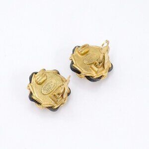 CHANEL Black Leather Pearl Button Earrings Gold Tone 93A Auth c1129