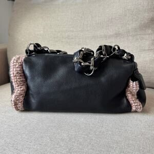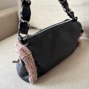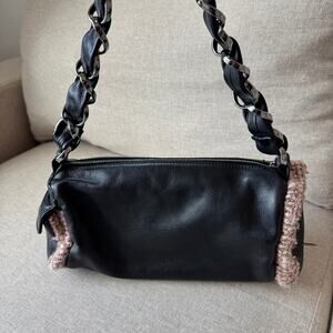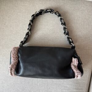 CHANEL Black Leather Pink Brown Tweed Trim Chainlink Barrel Shoulder Bag Y2K
