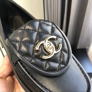 Elegant black loafers with quilted pattern. Features signature logo accent.
