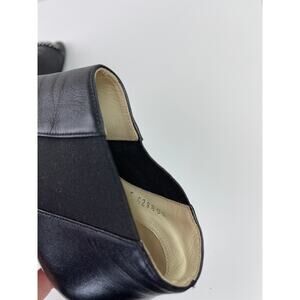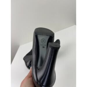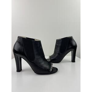 CHANEL Black Leather Silver Chain Heeled Peep Toe Booties Slip-On Almond Sz 38