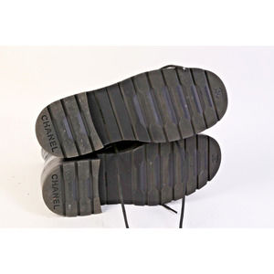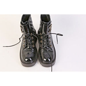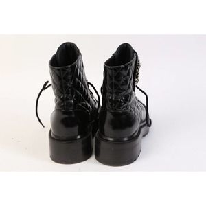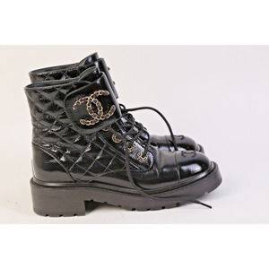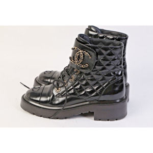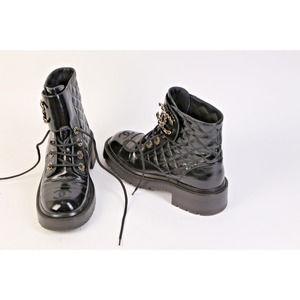 CHANEL Black Logo Quilted Patent Leather Combat Ankle Boots Booties Size 36