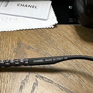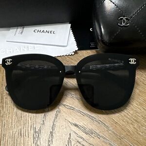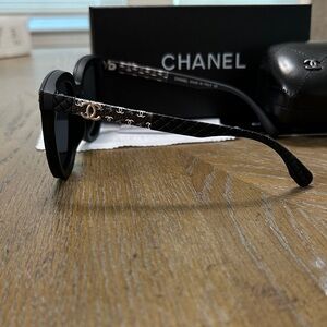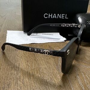 Sleek black sunglasses featuring iconic CHANEL logo. Comes with a stylish quilted case.