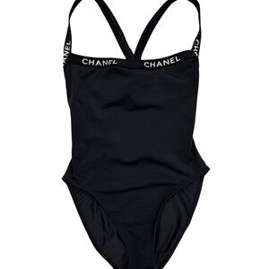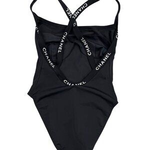Elegant black one-piece swimsuit. Features CHANEL branding on straps. Sleek and stylish design.