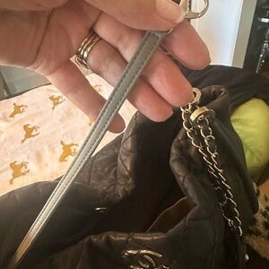 Elegant black quilted design. Silver chain strap. Iconic CHANEL logo accent. Slouchy shoulder bag. Used in excellent condition