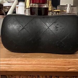 Chanel case in black quilted leather. Features silver logo detail. Timeless design.