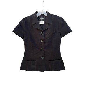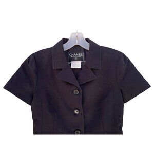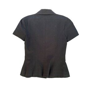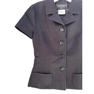 Elegant black skirt set. Short-sleeve jacket with button closure. Matching skirt for a classic look.