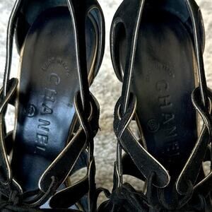 CHANEL Black Suede Tassel Lace Open Toe Heel Sandal IT 36