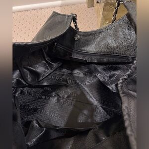 This much coveted Chanel caviar leather Coco cabas tote is no longer in production. The lining is in black Chanel monogram fabric. Large interlocking CC circular medallion hang from the strap. double leather and chain entwined straps may be worn comfortably over the shoulder or at elbow. Magnetic snap closure.