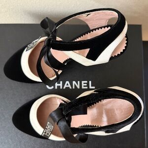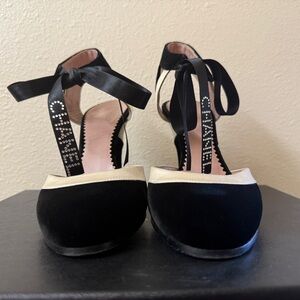 A rare and timeless pair of vintage Chanel heels, crafted in black velvet and ivory satin with elegant ribbon ankle ties. The standout feature is the crystal-embellished CHANEL logo across the front strap — an iconic detail that makes these shoes truly special.