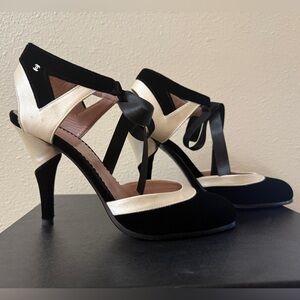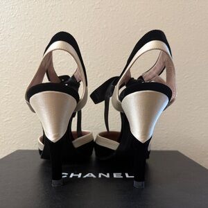 CHANEL Black and Cream Heels with Ribbon Detail