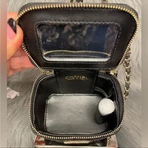 Chic CHANEL mini bag with quilted design. Features gold logo and chain accents. Perfect for stylish outings.