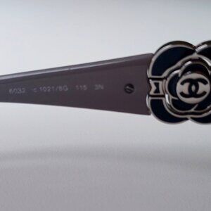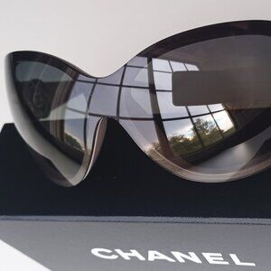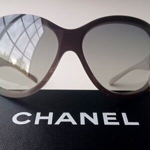 Elegant CHANEL sunglasses with black and gray tones. Features iconic logo on the side. Stylish and sophisticated design.