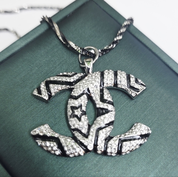 Elegant CHANEL necklace featuring black and silver crystals. Unique and stylish design. the chain is a black and silver s925 twisted rock, 20'.