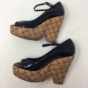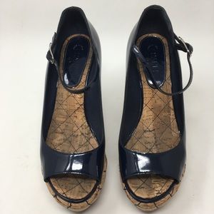 Elegant black patent leather with tan quilted wedge. Peep-toe design. Adjustable ankle strap.