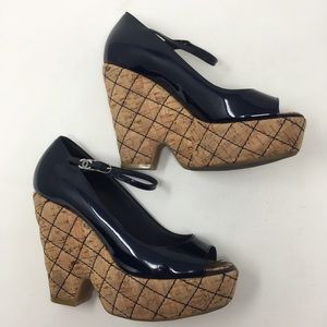 CHANEL Black and Tan Wedge Shoes