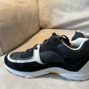 Experience the perfect blend of style and comfort with these CHANEL sneakers, featuring a sleek black and white color scheme. The shoes boast a sporty, casual design with a predominantly black upper and a durable white rubber sole. Ideal for everyday wear, these sneakers offer a modern aesthetic with subtle textural details and a low-top silhouette.