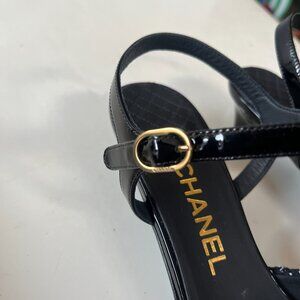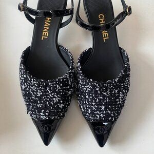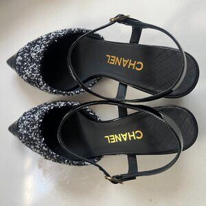 Elegant CHANEL heels with a black and white tweed design. Features a pointed toe and ankle strap.