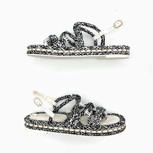 From the 2022 collection, these chunky, strappy flat sandals are the epitome of bold elegance. Crafted with blue and white corded rope straps, a delicate silver-tone interlocking CC logo charm dangles from the ankle straps, and a leather-weaved chain accents the midsoles.