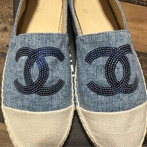 Step into luxury with these CHANEL espadrilles, featuring a chic two-tone design in blue and ivory. The shoes boast a prominent interlocking CC logo on the blue denim portion, adding a touch of elegance to the casual style. With a comfortable jute band around the sole, these espadrilles are perfect for a stylish summer outing.