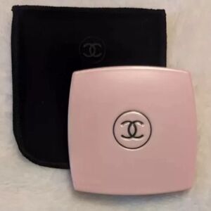 Features one classic mirror on one side and a magnifying mirror on the other side. Dimensions: 2.75" x 2.75" and 0.5" when closed. Comes with authentic Chanel black pouch.