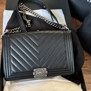 EXQUISITE Chanel Boy Bag in Black Chevron Caviar. Includes dust bag.