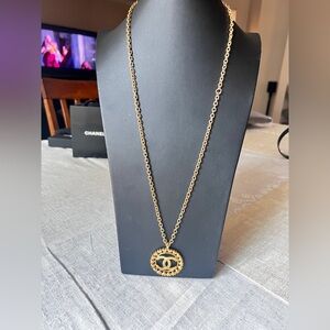 Pretty long with substantial chain. Pendant is such statement in it self.