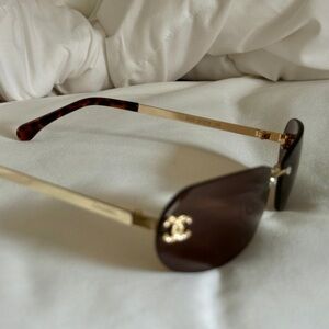 Stylish vintage CHANEL sunglasses in rich brown. Features elegant gold accents. Perfect for a sophisticated look.