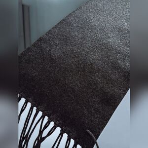 This CHANEL Cashmere scarf features a solid gray, Taupe and brown color and a classic design that enhances any ensemble. Made from cashmere fabric, it includes a stylish fringe detail at one end, making it an ideal accessory for various occasions.