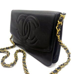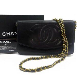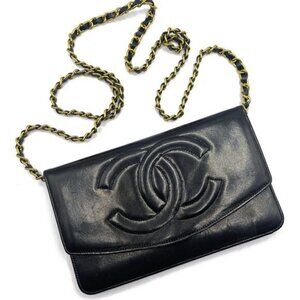 CHANEL CC Classic Timeless Lambskin Flap Wallet with Chain Purse Black Crossbody