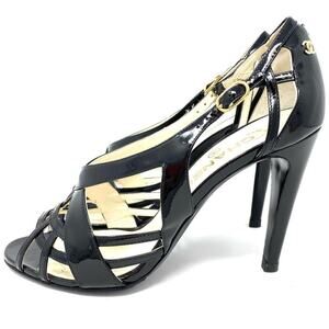 AUTHENTIC CHANEL CC LOGO BLACK PATENT LEATHER HEELS SANDALS SZ EU 39 or US 9 in excellent preloved condition. Minor signs of wear throughout. Includes original box and 2 dust bags. Guaranteed Authentic or your money back.
