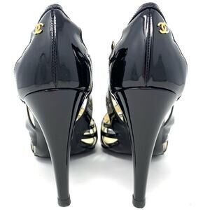 AUTHENTIC CHANEL CC LOGO BLACK PATENT LEATHER HEELS SANDALS SZ EU 39 or US 9 in excellent preloved condition. Minor signs of wear throughout. Includes original box and 2 dust bags. Guaranteed Authentic or your money back.