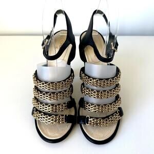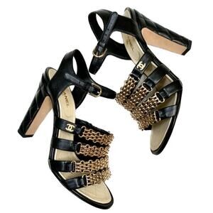 CHANEL CC Logo Black Lambskin Quilted Heels Gold Chain Strap Sandals IT 39