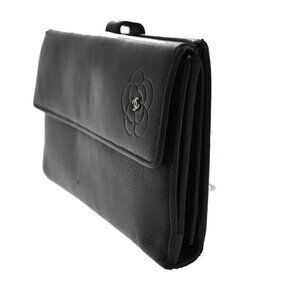 CHANEL CC Logo Camellia Long Bifold Wallet Purse Leather Black SHW