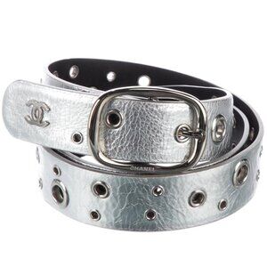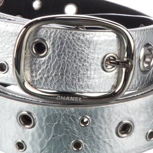 Auth CHANEL CC Logo Eyelet Metallic Silver Leather Belt.