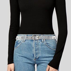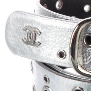 CHANEL CC Logo Eyelet Metallic Silver Leather Belt