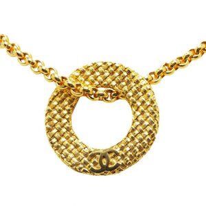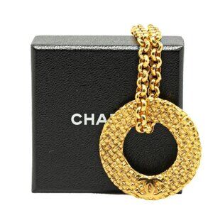 CHANEL CC Logo Mesh Circle Round Necklace 36" Gold Tone 29 Auth