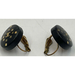 Authentic Chanel Black Gold Square Pattern Logo Clip On Earrings Round Style Authentic Stamp. This item was authenticated by "Authenticate First.Com". Please, see photos for details.