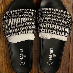 CHANEL CC Logo Tropiconic Black Tweed Slides - Size 39 FITS US 8-8.5