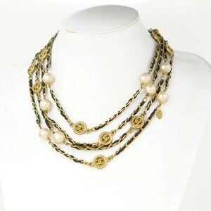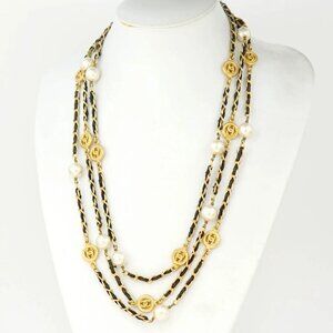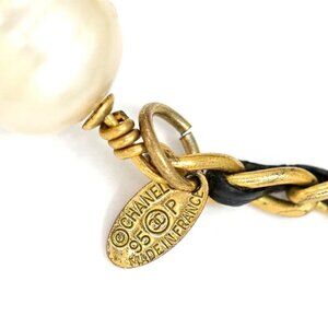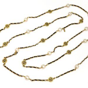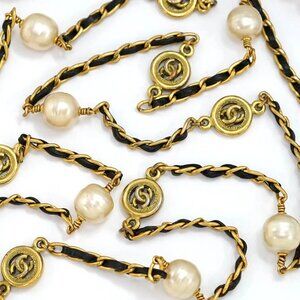 CHANEL CC Logos Black Leather Pearl Long Necklace 80" Gold Tone 95P w/Box #