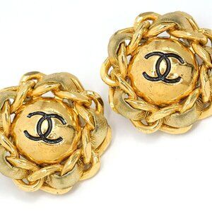 CHANEL CC Logos Gold Leather Clip-On Earrings Gold Tone 26 Auth #786-27