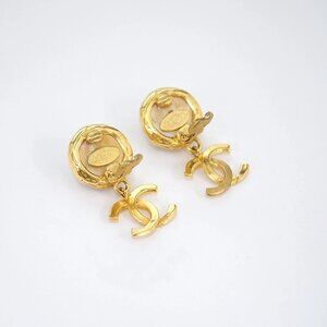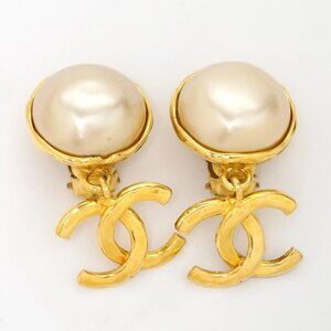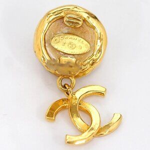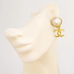 CHANEL CC Logos Pearl Dangle Drop Clip-On Earrings Gold Tone 29 Auth #31125