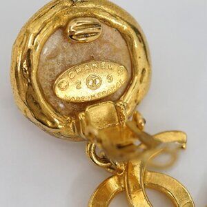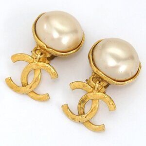 CHANEL CC Logos Pearl Dangle Drop Clip-On Earrings Gold Tone 29 Auth w/Box #6182