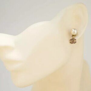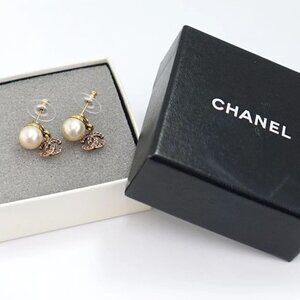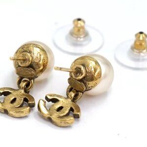 CHANEL CC Logos Purple Rhinestone Pearl Dangle Earrings Gold Tone 04A Auth w/Box