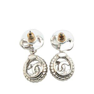 CHANEL CC Logos Rhinestone Bow Ribbon Stud Earrings Silver Tone A22B Auth w/Box